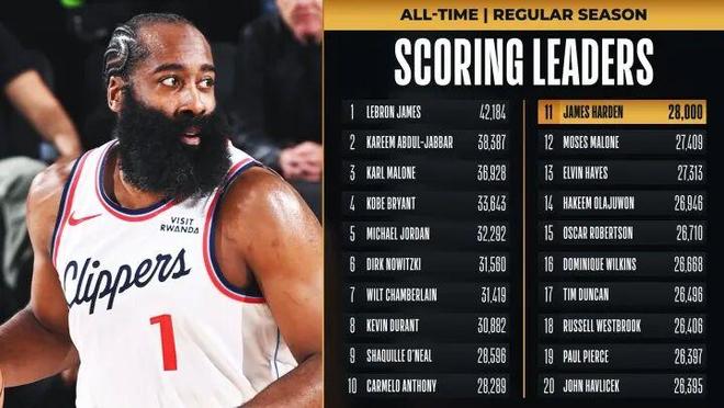 照登哥这样的火箭模式打下去,如无意外,下个赛季中段可能就能超30000分,我预计最终超越奥尼尔,排在NBA历史第9的位置。
